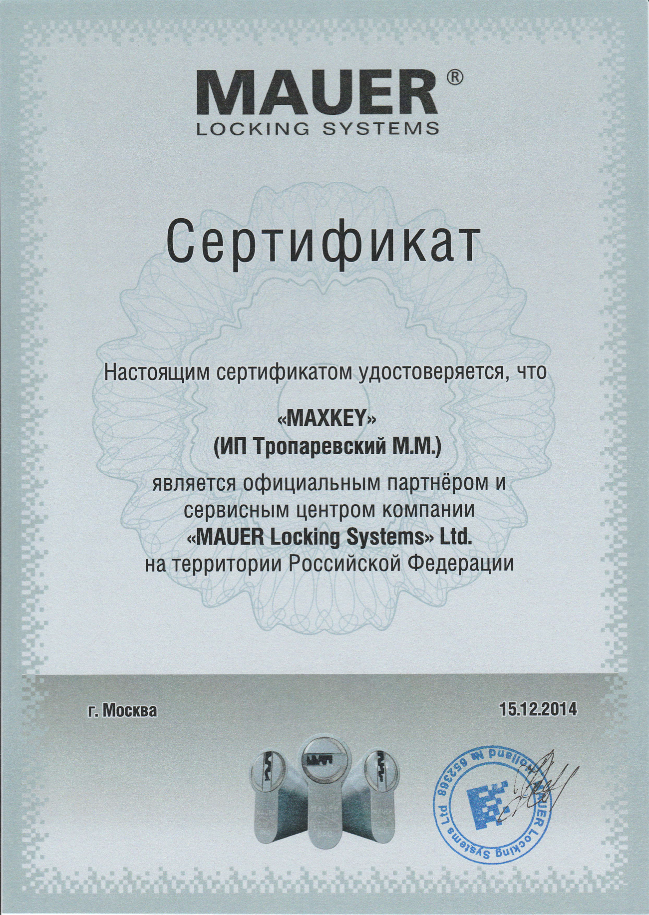 Компания MaxKey – авторизированный дилерский сервисный центр по изготовлению ключей MAUER в России. В наших мастерских можно изготовить дубликаты ключей для всех видов цилиндров и замков MAUER. Вся работа выполняется квалифицированными мастерами и исключительно на новейшем технологичном оборудовании (станки SILCA и KEYLINE).